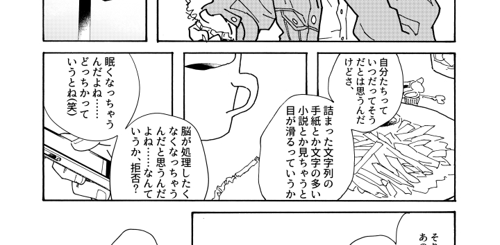 これは漫画を読むときの読み手が紙面の文章を図形として処理しているからなのでは…と考えたりしています。