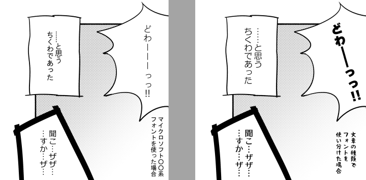 セリフやモノローグ、心内文といった箇所にフォントを使っていると格段に漫画っぽくなります。